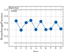 >>> # Example plotting multiple values >>> import torch >>> from torchmetrics.classification import BinaryAveragePrecision >>> metric = BinaryAveragePrecision() >>> values = [ ] >>> for _ in range(10): ... values.append(metric(torch.rand(20,), torch.randint(2, (20,)))) >>> fig_, ax_ = metric.plot(values)
