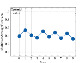 >>> # Example plotting multiple values >>> import torch >>> from torchmetrics.classification import MulticlassAveragePrecision >>> metric = MulticlassAveragePrecision(num_classes=3) >>> values = [ ] >>> for _ in range(10): ... values.append(metric(torch.randn(20, 3), torch.randint(3, (20,)))) >>> fig_, ax_ = metric.plot(values)