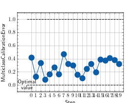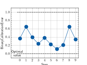 \[\text{ECE} = \sum_i^N b_i \|(p_i - c_i)\|, \text{L1 norm (Expected Calibration Error)}\]\[\text{MCE} = \max_{i} (p_i - c_i), \text{Infinity norm (Maximum Calibration Error)}\]\[\text{RMSCE} = \sqrt{\sum_i^N b_i(p_i - c_i)^2}, \text{L2 norm (Root Mean Square Calibration Error)}\]Where \(p_i\) is the top-1 prediction accuracy in bin \(i\), \(c_i\) is the average confidence of predictions in bin \(i\), and \(b_i\) is the fraction of data points in bin \(i\). Bins are constructed in an uniform way in the [0,1] range.