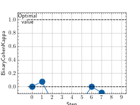>>> from torch import rand, randint >>> # Example plotting multiple values >>> from torchmetrics.classification import BinaryCohenKappa >>> metric = BinaryCohenKappa() >>> values = [ ] >>> for _ in range(10): ... values.append(metric(rand(10), randint(2,(10,)))) >>> fig_, ax_ = metric.plot(values)
