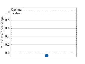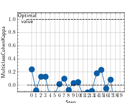>>> from torch import randn, randint >>> # Example plotting a multiple values >>> from torchmetrics.classification import MulticlassCohenKappa >>> metric = MulticlassCohenKappa(num_classes=3) >>> values = [] >>> for _ in range(20): ... values.append(metric(randn(20,3).softmax(dim=-1), randint(3, (20,)))) >>> fig_, ax_ = metric.plot(values)