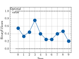 >>> from torch import rand, randint >>> # Example plotting multiple values >>> from torchmetrics.classification import BinaryF1Score >>> metric = BinaryF1Score() >>> values = [ ] >>> for _ in range(10): ... values.append(metric(rand(10), randint(2,(10,)))) >>> fig_, ax_ = metric.plot(values)