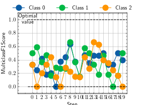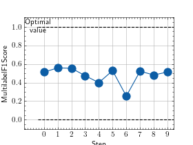 >>> from torch import rand, randint >>> # Example plotting multiple values >>> from torchmetrics.classification import MultilabelF1Score >>> metric = MultilabelF1Score(num_labels=3) >>> values = [ ] >>> for _ in range(10): ... values.append(metric(randint(2, (20, 3)), randint(2, (20, 3)))) >>> fig_, ax_ = metric.plot(values)