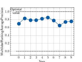 >>> from torch import rand, randint >>> # Example plotting multiple values >>> from torchmetrics.classification import MultilabelRankingAveragePrecision >>> metric = MultilabelRankingAveragePrecision(num_labels=3) >>> values = [ ] >>> for _ in range(10): ... values.append(metric(rand(20, 3), randint(2, (20, 3)))) >>> fig_, ax_ = metric.plot(values)
