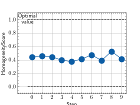 >>> # Example plotting multiple values >>> import torch >>> from torchmetrics.clustering import HomogeneityScore >>> metric = HomogeneityScore() >>> values = [ ] >>> for _ in range(10): ... values.append(metric(torch.randint(0, 4, (10,)), torch.randint(0, 4, (10,)))) >>> fig_, ax_ = metric.plot(values)