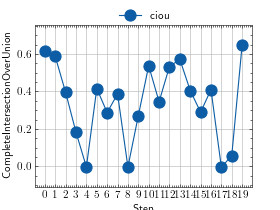>>> # Example plotting multiple values >>> import torch >>> from torchmetrics.detection import CompleteIntersectionOverUnion >>> preds = [ ... { ... "boxes": torch.tensor([[296.55, 93.96, 314.97, 152.79], [298.55, 98.96, 314.97, 151.79]]), ... "scores": torch.tensor([0.236, 0.56]), ... "labels": torch.tensor([4, 5]), ... } ... ] >>> target = lambda : [ ... { ... "boxes": torch.tensor([[300.00, 100.00, 315.00, 150.00]]) + torch.randint(-10, 10, (1, 4)), ... "labels": torch.tensor([5]), ... } ... ] >>> metric = CompleteIntersectionOverUnion() >>> vals = [] >>> for _ in range(20): ... vals.append(metric(preds, target())) >>> fig_, ax_ = metric.plot(vals)